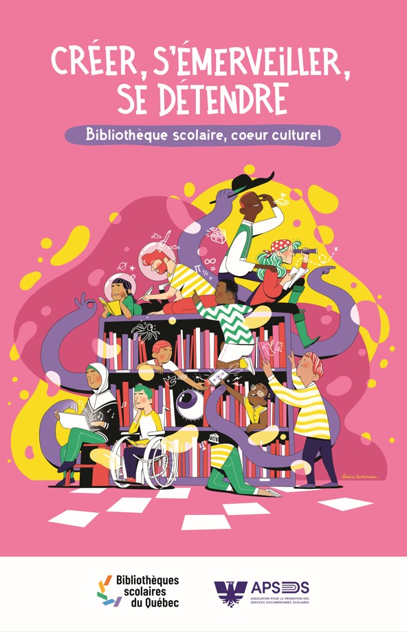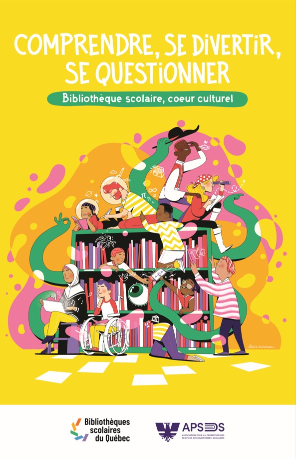 L’affiche rappelle avec force que la bibliothèque scolaire est un outil puissant pour l'enseignement : elle ouvre des horizons, nourrit les savoirs, encourage le vivre-ensemble et reflète la variété des rôles joués par les bibliothécaires et les techniciens et techniciennes en documentation du milieu de l'éducation.